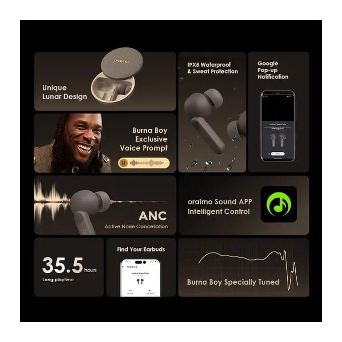 Burna Boy Voice Prompt – Unique Lunar Design – Active Noise Cancellation – oraimo Sound APP