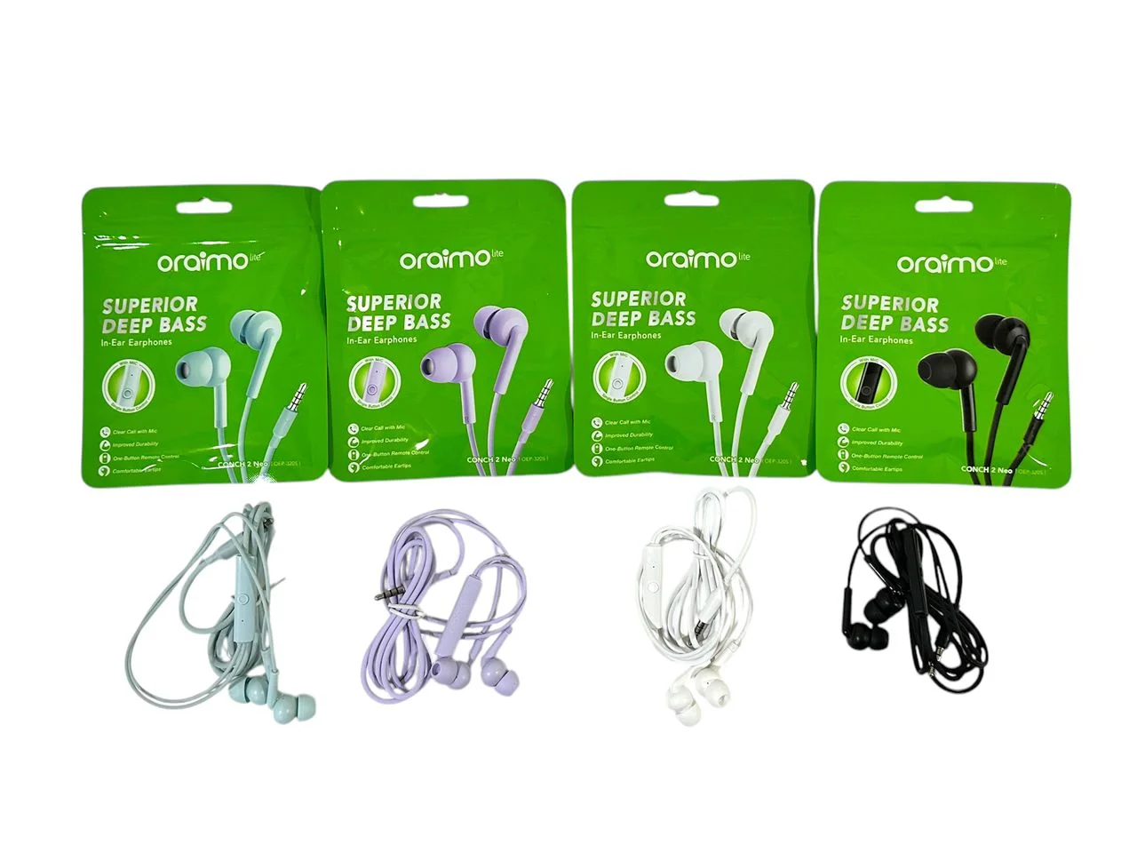 The Oraimo OEP-320S (Conch 2 Neo) are 3.5mm wired earphones featuring 10mm drivers for deep bass, a comfortable half-in-ear design, an in-line mic for clear calls, and a 1.2m cable, with specs like 16Ω impedance, 20-20000Hz frequency response, and 95±3dB sensitivity, suitable for mobile devices.