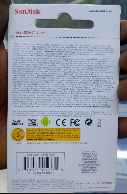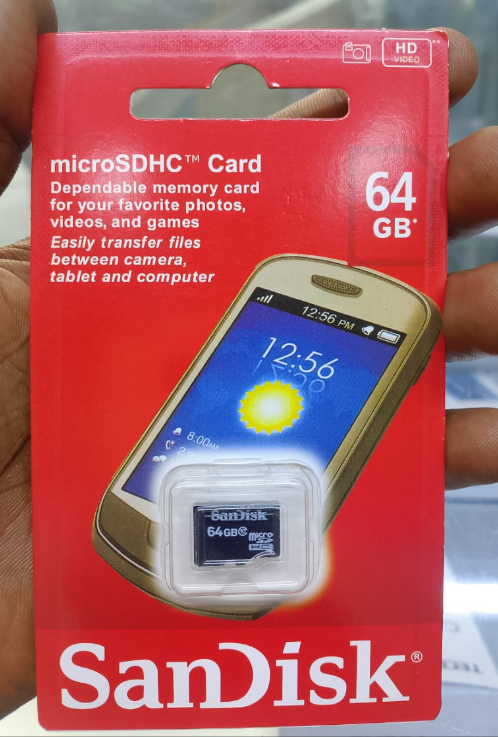 - Type and Capacity: It is a SanDisk microSDHC card with a 64 GB capacity.